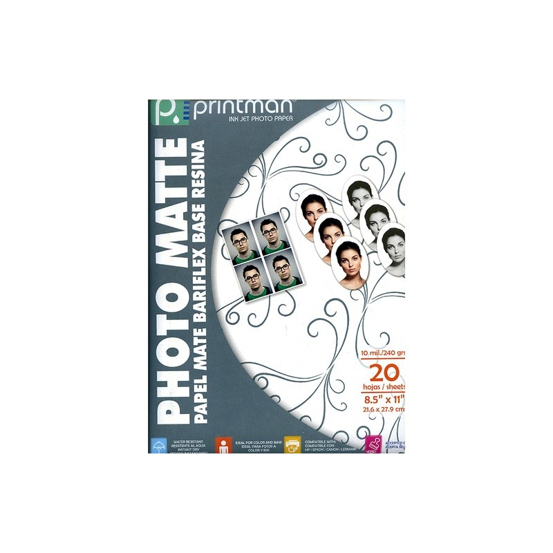 El papel Printman Photo Matte Bariflex 8.5"x11" con 20 hojas de base de resina, es ideal para fotos de identificación (Título, Diploma, Certificado). Su resistente base permite colocar adhesivo sin riesgo de amarillamiento. 10 mil./240grs.